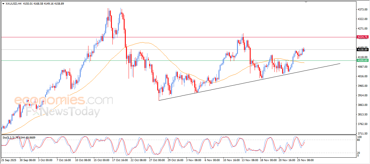 黄金价格在最后一个交易日内上涨,其持续在 EMA50 上方交易,相对强弱指标也出现积极信号,主要上涨趋势占据主导地位,并且与支撑性次要趋势线并行交易,巩固了这一趋势的稳定性。