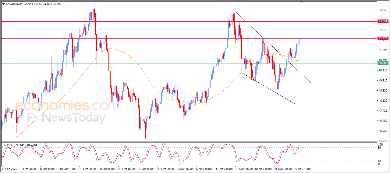 白银价格在最近的盘中交易中持续上涨,冲击 52.35 美元的阻力位。该阻力位是我们之前分析中的潜在目标位,相对强弱指标也出现了积极信号,尽管白银价格已达到超买水平。此外,白银价格在 EMA50 上方交易,这构成了动态支撑,为突破阻力位提供了新的动能。