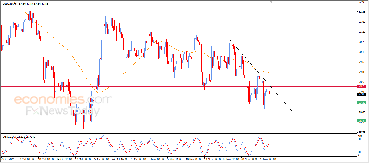 布伦特原油价格在今日开盘回吐部分此前跌幅后,在盘中最后阶段有所回落。由于价格稳定在 EMA50 下方,主要下跌趋势占据主导地位,且短期内与陡峭的次要下跌趋势线并行,因此下行压力持续存在。
